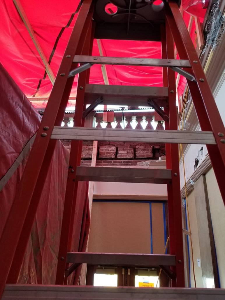 On the third floor, walls have come down to reveal the view that the rehearsal studio and event space will have from what was originally the second balcony and then the film projection booth and most recently a small conference room and lighting control booth.