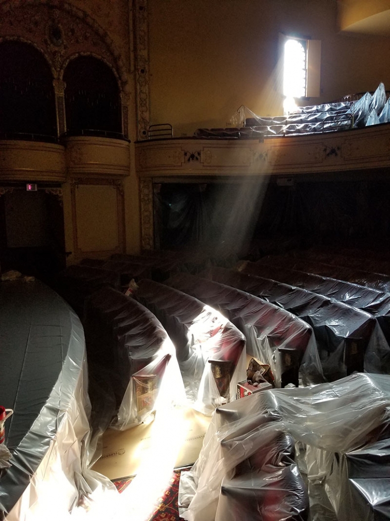 On the main level in the main house, seats are covered, and sunlight is streaming in through the windows as workers spend the next 7 – 10 days building scaffolding that will allow every painted surface to be cared for. Such dramatic natural lighting is surely a good sign for a theatre!